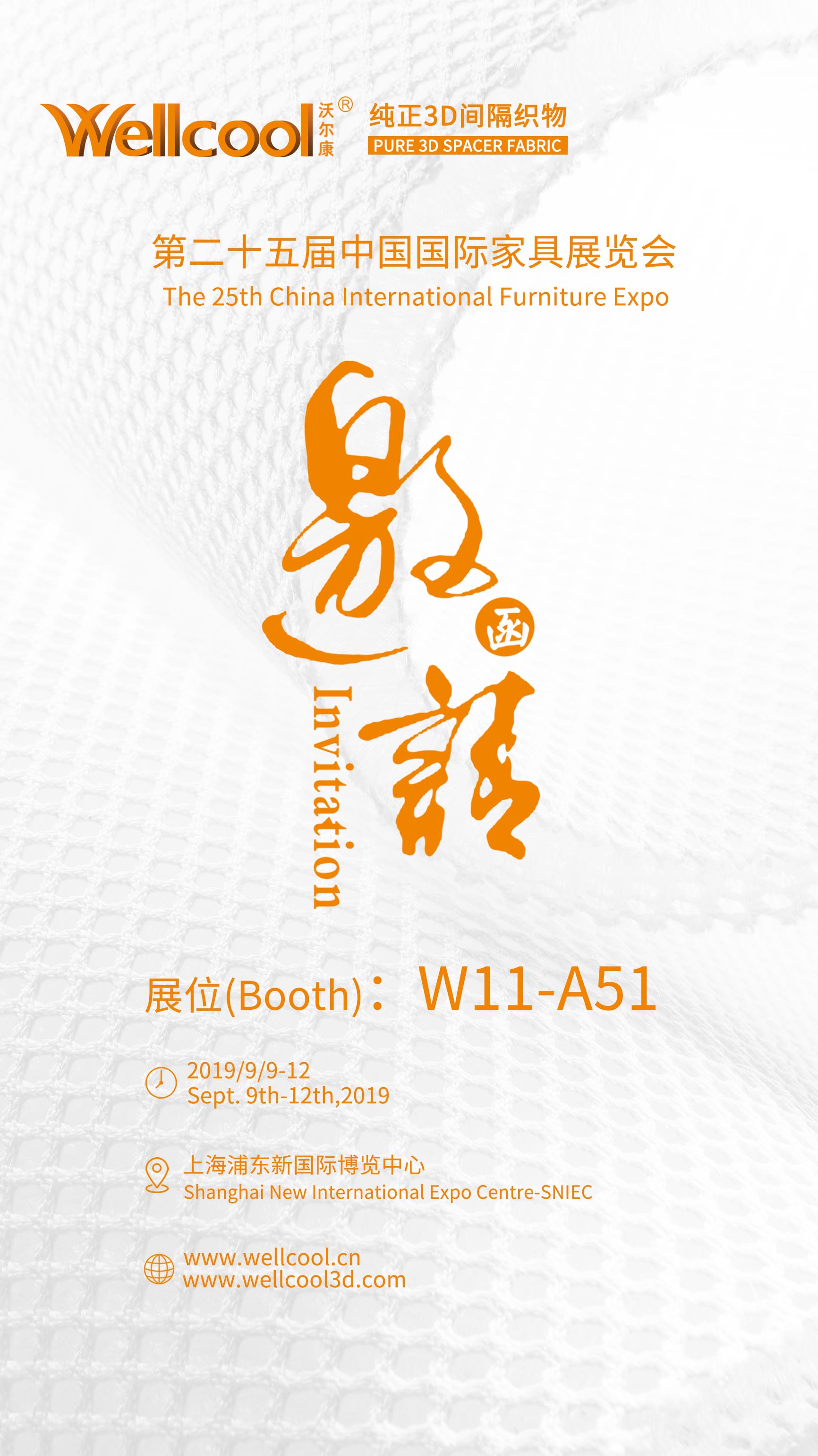 您好,我們誠摯邀請您參加2019年9月9日至12日在上海浦東新國際博覽中心舉行的第二十五屆中國國際家具展覽會。屆時(shí)將有眾多紡織同仁共聚上海。泉州沃爾康墊業(yè)科技有限公司在W11號展館A區(qū)51號恭迎您的蒞臨指導(dǎo)