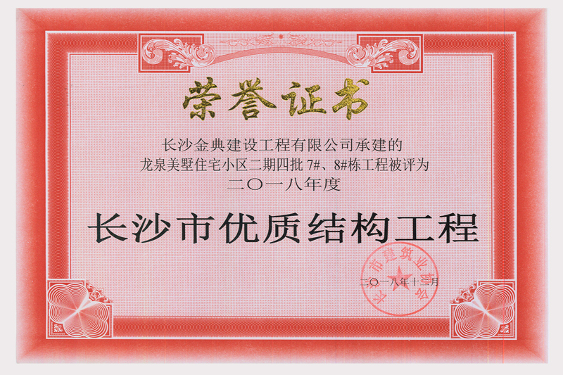 龙泉美墅项目二期四批7、8#栋荣获“长沙市优质结构工程”奖