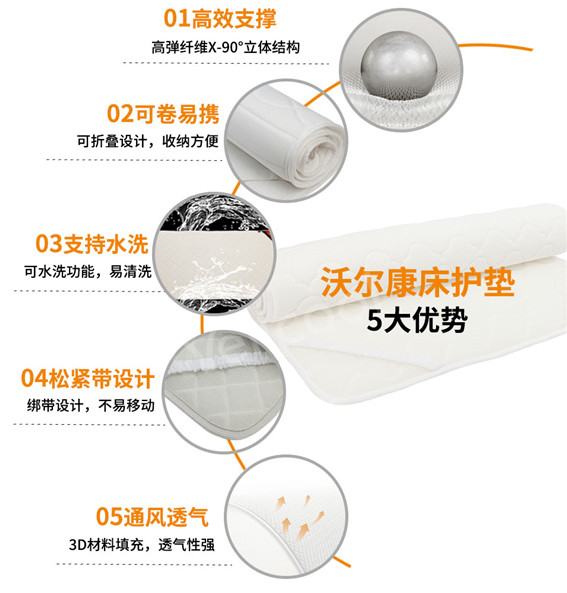 沃爾康3D床護墊四周還設計優(yōu)質的松緊帶,可牢牢固定防止滑動移位,再也無需頻頻整理床單。夜晚蓋被太多容易出汗,沃爾康床護墊輕薄透氣,排濕性能好,不用擔心被窩潮濕難受。沃爾康3D床護墊清洗方便,可直接沖洗,水流秒過,讓床上用品時刻保持干凈清爽。