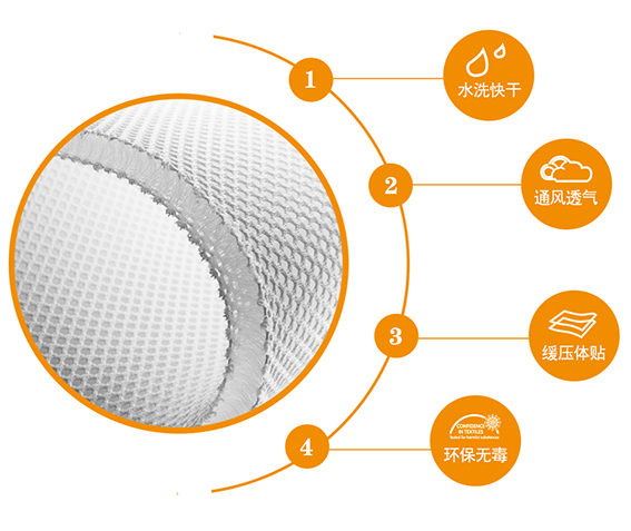 2、干爽網(wǎng)面通風透氣:采用雙面網(wǎng)孔,呈現(xiàn)六面透氣中空立體的結(jié)構(gòu)。