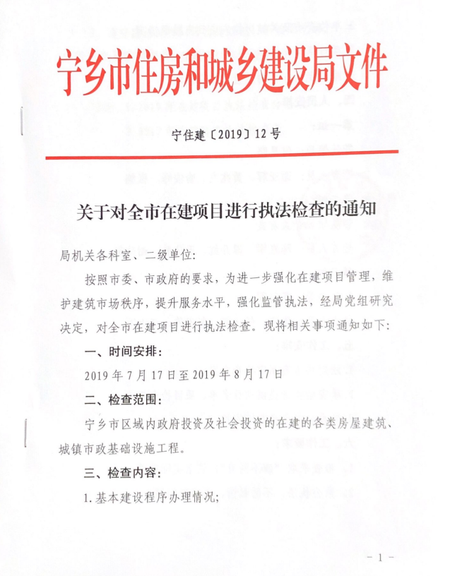 《关于对全市在建项目进行执法检查的通知》(宁住建[2019]12号